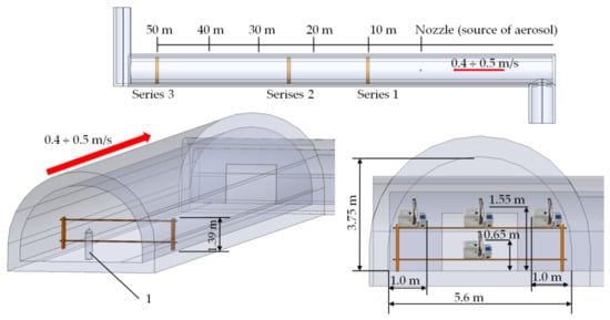 A detailed diagram of the test stand and how the in situ tests were conducted is shown in Figure 2. The aerosol source was a water nozzle located about 25 m from the inlet (inlet) of the excavation. The water nozzle used ensured the generation of fluid droplets distributed to the volume limited by the shape of a full cone, which had a nozzle opening at its starting point and outlet. Spectrometers were located at a distance of 10 m, 25 m, and 50 m from the nozzle that recorded the distribution of aerosol concentration changes in the air stream. Measurements were taken at four points of the cross-sectional area of the underground excavation at heights of 0.65 m and 1.55 m above the floor, as well as at the left and right sides of the excavation edge at the height of 1.55 m above the floor. The measurement was carried out for 3 min, during which aerosol was injected continuously into the underground excavation.
