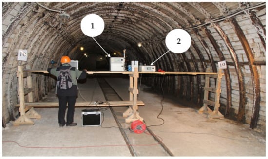 View of laboratory rig in the underground experimental excavation: 1—Spectrometer SMPS 3936; 2—Spectrometer APS 3321.