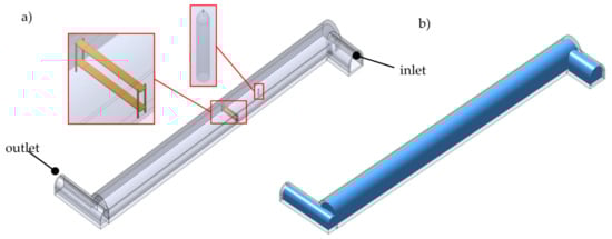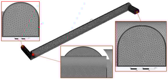 The geometrical model presented in Figure 5, 80 m long and with a cross-sectional area of 17m2 (Figure 5a), is a representation of the real underground research object. On its basis, the volume of the fluid was separated (Figure 5b). The defined volume of the fluid filling the model excavation was discretized, i.e., the spatial model was divided into smaller finite volumes. Figure 6 presents the effects of discrediting the developed 3D model of the underground excavation.