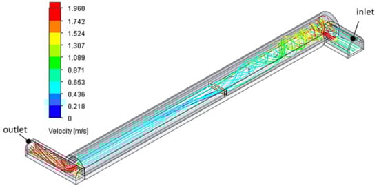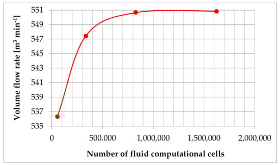 In order to ensure that the results obtained from numerical calculations were adequate, the mesh density was considered before using the discretized geometry for simulation. Figure 6 illustrates the mesh refinement study on the volume flow rate results in the numerical model. Moreover, in order to ensure that the numerical grid was correct the following mesh quality was developed [,]: