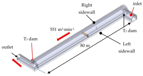 An object in the form of a section of an underground excavation located at a depth of 30 m was selected for research. The analyzed excavation site was separated from the ventilation network of the Experimental Mine Barbara (EM Barbara). EM Barbara is a part of the research and development infrastructure of the Central Mining Institute. The underground excavation is located close to the inhalation shaft (Barbara shaft) between the main pavement west and the ventilation pavement. The excavation is separated from pavements by two ventilation dams marked with T2 and T3 symbols. The T2 dam regulates the value of air flows at the inlet to the underground excavation. The T3 ventilation dam is an element of air control at the outlet from the excavation.