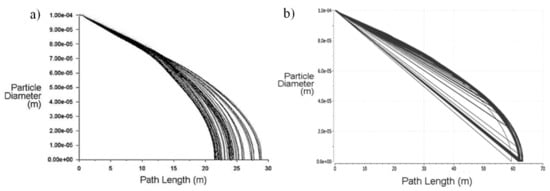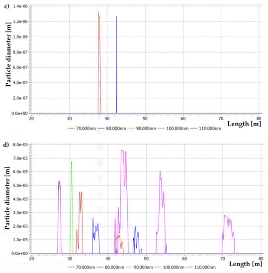 If the results of the changes in the concentration of ultrafine aerosols in the graph in Figure 17 are compared with the results of numerical calculations presented in Figure 12c,d, the trend in the increase in aerosol concentration measured at a height of 1.55 m on the floor of the excavation can be observed. On a section of 28 m (5 m from the nozzle) from the inlet to the model excavation, numerical simulations showed an increase in the size of coarse aerosol particles in the excavation, similarly to real measurements. Moreover, along the length of the excavation approximately 50 m (25 m from the nozzle), numerical simulations have shown the maximum aerosol particle size values. Additionally, in this length of the excavation section, numerical calculations showed the inlet of the aerosol particle size drop until complete evaporation, which was observed at a distance of 60 m (45 m from the nozzle) from the excavation inlet.