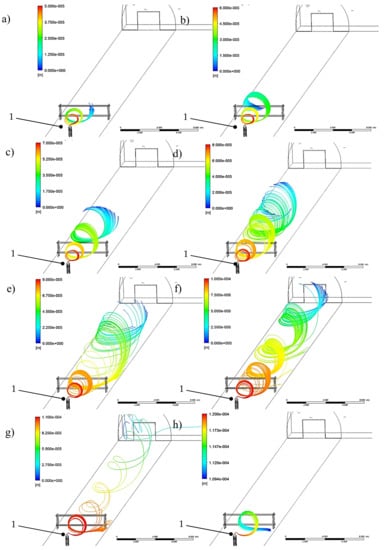 Particles greater than 500 μm generated by sneezing/coughing/speech fall to the ground in a few seconds []. Droplets of 50–200 μm, which are significantly affected by gravity, fall as the flow velocity decreases []. The estimated airborne duration of particles up to 10 μm (speech, coughing) can reach up to 3 h [] according to data in the literature. More detailed results are illustrated in []. Laboratory tests on respiratory droplets emitted during speech (16.0 μm) and coughing (13.5 μm) (the estimated number of droplets in the test was between 947 and 2085) showed that 90% of large-sized droplets (>50 μm in diameter) settled rapidly within 1 ÷ 2 m of the emission point. The authors proved that only 4–10% of the droplets remained suspended in the air (diameter less than 10 μm), and it took less than 0.1 s for a droplet to evaporate and reduce its diameter from 5 ÷ 10 μm to 2 μm. In addition, studies have shown that more than 82% of particles (drops) were in the size range 0.74–2.12 μm, which may affect the transit of the virus in the air [].