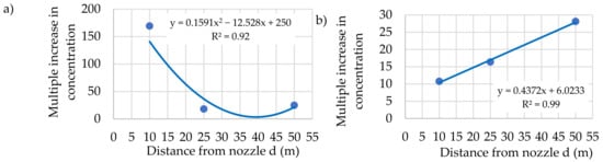 The curves in Figure 15a show a decrease in the concentration of coarse aerosols in the excavation axis from a value of approximately 170 at a distance of 10 m from the nozzle (35 m from the inlet of the excavation) to a value of approximately 25 at a distance of 50 m from the nozzle (75 m from the inlet of the excavation) at a height of 1.55 m above the floor. In the case of measuring coarse aerosols at a height of 0.65 m above the floor (Figure 15b), actual measurement results showed an increase in the concentration multiplication factor from a value of about 11, at the distance of 10 m from the nozzle (35 m from the inlet of the excavation) to the value of approximately 30 at the distance of 50 m from the nozzle (75 m from the inlet of the excavation).