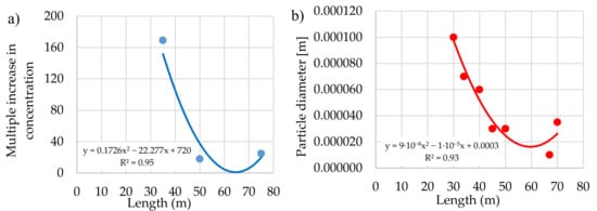 Comparisons of the concentration and the particle diameter of coarse aerosols depending on the length of the underground excavation at the height above the floor 1.55 m: (a) in situ measurements, (b) CFD calculations.