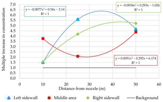 Measurement of aerosols made at the height of 1.55 m above the floor of the excavation (Figure 17) show an increase in concentration on the left and right sidewall. However, in the axis of the excavation, the concentration of aerosols decreases with the distance from the nozzle. The concentration of ultrafine aerosols at a height above the floor of 1.55 m, depending on the distance from the source of injection, can be predicted by equations: