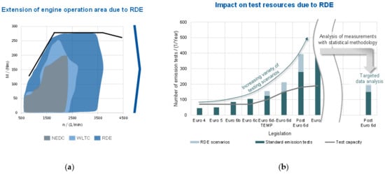 In addition to the adjustment of the emission limits themselves, the procedures and methodologies for the conduction of the relevant emissions and fuel economy tests are being adapted. The introduction of the “Worldwide harmonized Light vehicles Test Procedure” (WLTP) including the “Worldwide harmonized Light vehicles Test Cycle” (WLTC) and the Real Driving Emissions (RDE) tests required for legislative vehicle testing under EU6d-TEMP [] has led to a milestone in vehicle and exhaust gas aftertreatment development []. Following the RDE introduction for European legislation, RDE also becomes a new challenge for the Chinese market, allowing the transfer of lessons learned from the previously developed approaches for EU6d [].