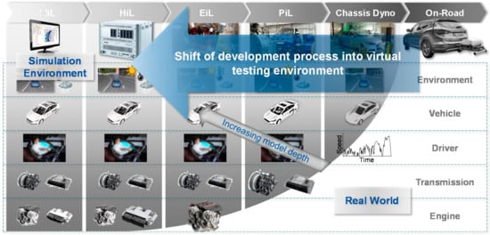 While on-road testing requires a complete vehicle with all components, the first level of virtualization is already performed on the chassis dyno. Here, the driver follows a target speed trace in the real vehicle. All ambient influences and the vehicle resistances are simulated or controlled by the test bed. This allows for testing a certain vehicle with specifications of any other vehicle by adjusting the resistance coefficients that control the load that the chassis dynamometer applies to the wheels. In earlier development phases with a complete system not yet ready for deployment or to support overall vehicle testing, individual components can be operated on dedicated test benches as if they were in the complete vehicle [,]. For this purpose, the periphery of the component to be tested is simulated by a model environment. The scope of the real components can be varied as desired. Typical setups for example are PiL, EiL and HiL (Figure 3). In the PiL setup, electric motors are used as load machines for the drive wheels, simulating the real-world resistances