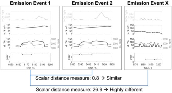 The same procedure is also performed for the comparison of each event to each non-event. By comparing the distance measures for each comparison of event to event and event to non-event to a set threshold [], an information about the number of similar events and similar non-events can be obtained for rating of reproduction quality and relevance based on the occurrence within the conducted emission tests. The higher the ratio of similar events to similar non-events for an event is, the higher the reproduction quality, as re-driving such an event will quite likely lead to a critical event again (considering the reproduction of the signals that were defined as features for the comparison).