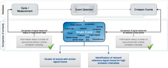 Each window that exceeds the relevant threshold value is marked with a flag indicating the critical sequences. Thus, all critical data (“events”) per definition of the threshold value are identified automatically and marked as such. Remaining data are considered as uncritical (“non-events”). Storing the detected sequences in a common database allows their later analysis and statistical evaluation. As all signals measured by the ECU and the emission measurement equipment are stored, the focus of the analysis can be adjusted easily and different signals can be included.