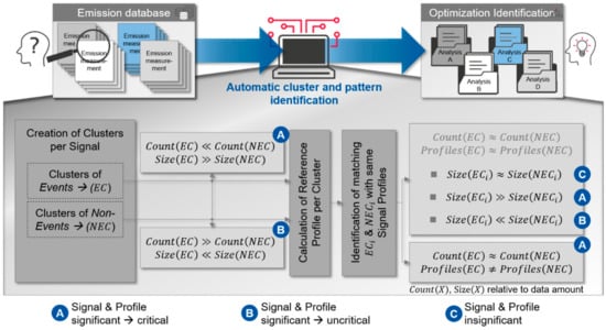 Applying the same cluster approach to the signal traces of non-events allows for a statistical evaluation of how relevant a certain group of profiles might be with regard to their root cause of critical emission intensity. After clustering, the results for non-events and events are compared. The number of identified significant groups gives a first indication whether signals might be relevant or not. Signals that cannot be clustered into a representative number of groups neither for events nor for non-events do not suggest for a clearly problematic category profile (Figure 6B). This assumes that a sufficient number of emission measurements is included in the database. Such traces can still reproducibly lead to high emission intensities, but they are rather singular appearances or are only critical in combination with characteristic behaviors of other signals.