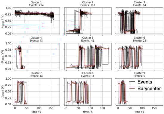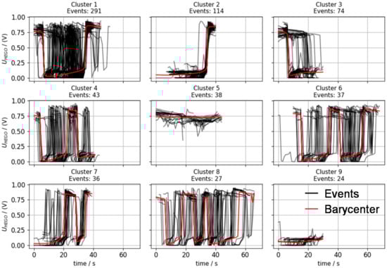 While the black profiles show all single traces of the clustered events and non-events, the red profiles indicate the reference profile identified by the Barycenter approach []. The downstream lambda voltage is selected, as it provides a direct indication of the catalyst state and thus the sufficiency of converting NOX emissions. Here, the comparison of the number of sequences in a cluster (indicated as “Events: #” above each plot) allows the suggestion of typical critical and uncritical profiles. Being the biggest clusters, cluster 1 represents the most typical traces for events (drop of voltage for more than 20 seconds, which corresponds in fact to a lean mixture) and non-events (constantly high voltage, rich mixture). Furthermore, sequences with a higher share of the low voltage compared to high voltage shares (e.g., events cluster 2 and non-events cluster 2 with similar sizes or events cluster 3 and non-events cluster 4 with twice as many critical as uncritical sequences) promote a higher risk of increased emission intensity in terms of NOX emissions.