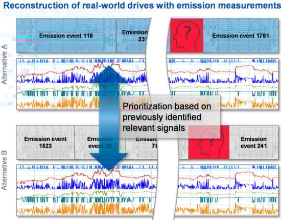 The concept of the methodology described below aims at covering these weak spots. In contrast to pre-defined signal sets for comparison, a clustering approach is used to identify relevant signals, critical and uncritical traces of these and thus can highly support the engineer on a root cause analysis. Focusing on the thereby detected relevant signals, a novel approach is implemented to invert the comparison of events to real-driving data, allowing to pre-estimate the criticality with regards to emission intensity of driving routes and to identify white-spots in the variance of existing emission measurement data. Finally, a methodology is described that allows to generate a driving profile while a test or simulation is running, instead of generating a fixed profile before the test starts.