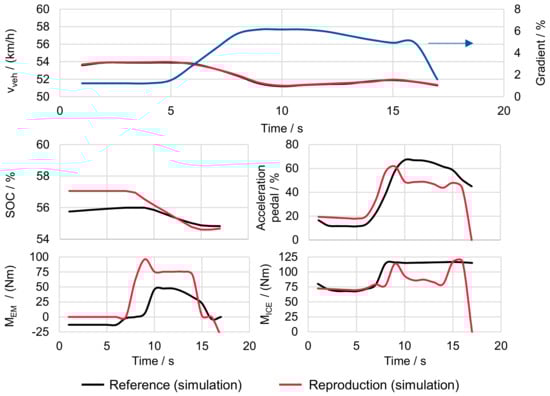 In contrast to system-specific approaches, there are those that focus on real-world routes or realistic driving styles that are intended to represent real driving behavior with as little synthetic influences as possible [,,,,,,,,]. Testing of real driving routes is often transferred to a test bench environment to increase reproducibility and to use highly accurate measurement systems. Here, the driving profiles are transferred to the chassis dynamometer or engine test bench. This requires prior recording of the driving profile or load points via the engine control unit and needs re-recording or computational adjustment of the load points if significant calibration changes occur or another vehicle is to be tested. To increase the reproduction quality, MASON et al. describe a methodology for the specific adjustment of the load points performed on the chassis dynamometer []. These may deviate from the theoretically resulting resistances due to numerous influences from the speed and geodetic road profiles, but are decisive for the validation of replay measurements. Especially the reproduction of altitude and road gradient influences can have a major effect on the reproduction of engine operating points and must be reproduced with a high level of accuracy, as described in []. In addition to real routes, recordings are made of real trips in daily operation, which are transferred to a database. As for example described in [,], based on Markov chains, new driving profiles are then synthetically created to represent the most probable speed and acceleration sequences. Such approaches represent typical regional driving behavior very well, but are less suitable for representing vehicle-specific weak points which are relevant for calibration.