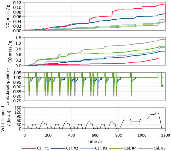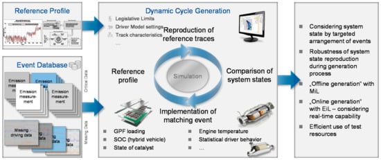 Worst-case cycles can be created for specific vehicles as well. The generation of such test scenarios is often associated with either simulation or engine test bench measurements. When using a modeled environment such as described in [,,], many different scenarios can be evaluated in an efficient way. A DoE approach is subsequently used to evaluate the simulated emission intensity. Based on control parameters (e.g., cycle dynamics), the profile is then adjusted to define the worst-case scenario for the vehicle. Alternatively, DoE approaches for different operating points and traces on an engine test bench can be used once the real system is available []. Based on the results, cycles can be created for use on either dynamic engine test benches or chassis dynamometers.
