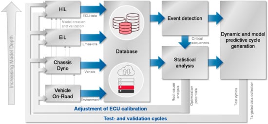 Vehicle development is already supported by virtual test environments in many different phases and tasks. Especially in conceptual design and technology selection as well as for On-Board Diagnostics (OBD) verifications, simulation-based test scenarios are used [,]. Increasing virtualization is also taking place in the area of drivability [,,] and emissions calibration [,,] to increase the efficiency of the development processes.