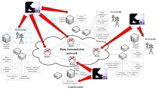The result of such modernization should be a unified technological communication system of the power industry, which is necessary for the stable operation of the whole power system and its components []. Large-scale implementation of packet telecommunication technologies in the power system largely ensures the cost-effective and uninterrupted functioning of all elements of electrical network, from control centers to substations and high-, medium- and low-voltage distribution devices (Figure 1).