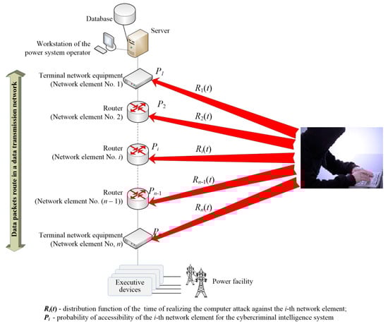 By carrying out cyberattacks on automated systems and technological DTNs, malefactors disrupt the normal functioning of the power complex elements []. Therefore, the automation systems and technological DTNs that are being implemented in power complexes must provide operational management of energy resources, as well as meet the high cybersecurity requirements for both automation system elements and technological DTNs. Therefore, the task of evaluating the quality of the functioning of the technological DTN of the energy complex is relevant when a malefactor implements cyber actions.