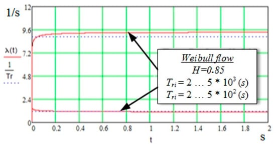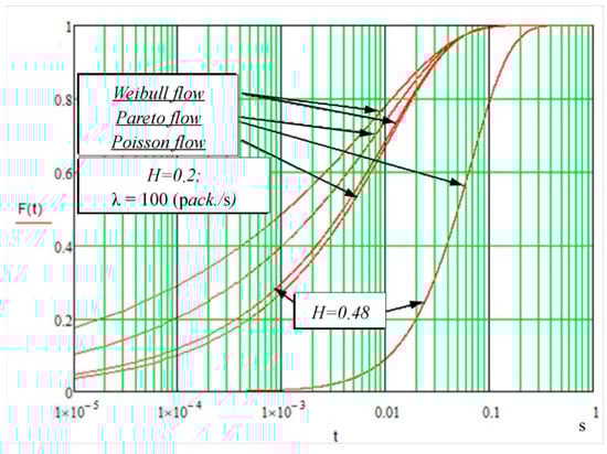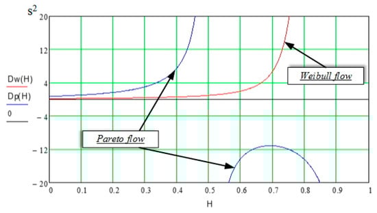 When the Hurst index increases (H ≥ 0.2), the distribution function of the packet delivery time in the Weibull flow comes close to an exponential distribution, and when the Pareto flow is serviced, the distribution function goes down, which leads to a considerable increase in the average time of successful data delivery and an increase in the probability of packet loss. This is explained by the difference in the dependence of the variation coefficients of the Weibull and Pareto flows on the value of the Hurst index. It should be noted that, when we simulate the delivery process, the Hurst index value, close to H ≈ 0.5, is the limiting value for the Pareto flow, because if H ≥ 0.5, dispersion for this distribution is not determined [] (Figure 9), therefore the simulated results of the delivery process obtained at these H values will be wrong.