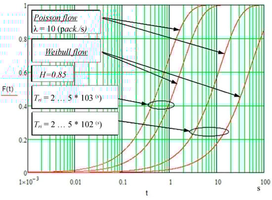 The works [,,,,] are focused on the calculation of the probabilistic and temporal characteristics of the data transmission network, such as the average data transmission speed, average queueing time and delay time jitter. In this case, the main attention in calculating the required values is given to taking into account the self-similarity of the transmitted data flow. In our opinion, the analysis of calculation methods has been carried out more completely in [], where relations for determining the distribution functions of the data delay time, taking into account the categorization of the transmitted flows and their self-similarity. In this case, the distribution functions of the waiting time and the service time are approximated by exponential distributions. At the same time, the analysis of the Laplace–Stieltjes transformation of the service and waiting time distribution function given in [,] shows that this distribution is not exponential, therefore the delay time distribution is not exponential either; this distribution is defined as an integral convolution of the service and waiting time distributions. Besides that, the results given in these works do not take into account how results of the cyberattack implementation by a malefactor influence the value of the calculated parameters.