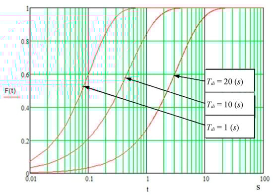 The graph of the distribution functions of successful data delivery in the context of cyberattacks when average time values Tdi of rehabilitation of functioning of network elements are different.