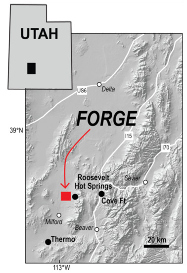 - Allis, R.; Gwynn, M.; Hardwick, C.; Kirby, S.; Moore, J. Thermal characteristics of the Roosevelt Hot Springs system, with focus on the FORGE EGS site. In Geothermal Characteristics of the Roosevelt Hot Springs System and Adjacent FORGE EGS Site, Milford, Utah. Utah Geological Survey Miscellaneous Publication 169; Allis, R., Moore, J., Eds.; Utah Geological Survey: Salt Lake City, UT, USA, 2019; p. 24. [Google Scholar] [CrossRef]
