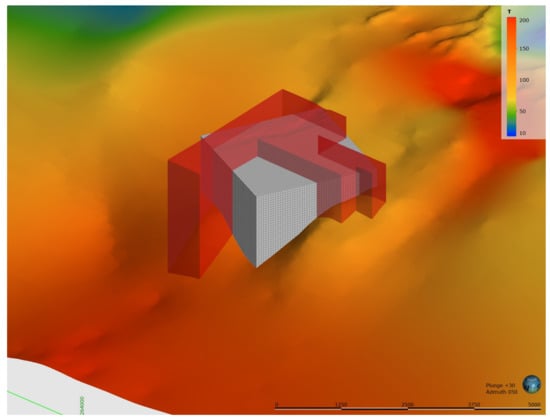 The Phase 2 FORGE numerical model domain was sized to accommodate the geothermal reservoir intersected by the site pilot well, Well 58-32, and envisioned future injection and production wells along with their predicted stimulation volumes created during FORGE Phase 3. A model domain of 2.5 km × 2.5 km × 2.75 km was located nominally between 400 m and 3200 m below the land surface (see Figure 3). The mesh was aligned with the principal stress direction (N25E) estimated from borehole breakout and drilling induced fracturing analysis in Well 58-32 [11]. A mesh spacing of 50 m was uniformly used, resulting in a total of 137,500 grid cells.