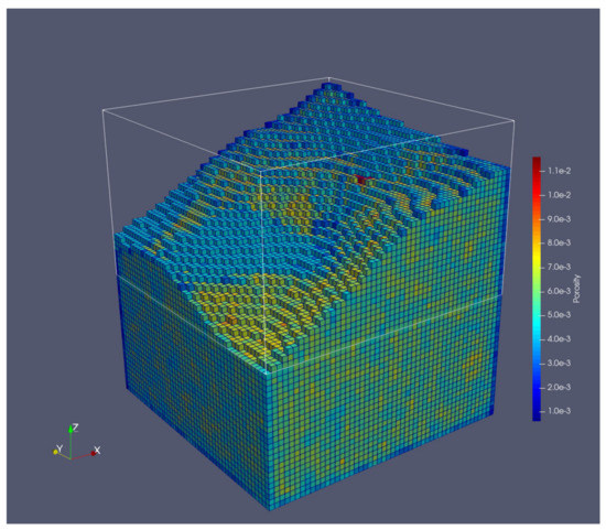 Numerical model domain of the granitoid shown with grid cells, looking from the southwest toward the northeast. Granitoid coloring is based on porosity determined from upscaling the DFN. Dimensions are 2.5 km × 2.5 km in the horizontal directions and 2.75 km in the vertical direction.