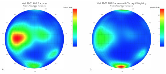 Contour plots of 58-32 FMI fracture poles in upper hemisphere: equal area stereonets showing the relative intensities before bias correction (a) and after applying Terzaghi weighting (b).