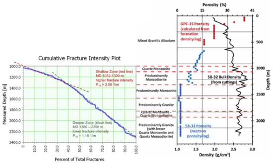 Depth aligned CFI plot of 58-32 FMI fractures in granitoid on the left and measured density values from drill cuttings at 100-foot intervals in Well 58-32 on the right, adapted from [33].