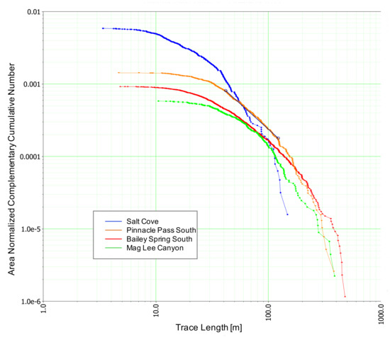 Power law fit to outcrop trace length data. The slopes of the straight-line segments on this log-log plot of the area normalized complementary cumulative number vs the trace lengths range from −1.3 to −1.9.