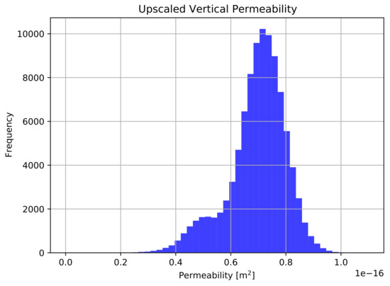 The linear coefficient, b, is determined by requiring that the upscaled fracture permeability match the measured granitoid permeability. Once upscaled to continuum values, the average directional fracture permeabilities in cell coordinate directions for the granitoid were 6.5 × 10 m, 6.5 × 10 m, and 7.0 × 10 m, respectively. A histogram of the upscaled fracture vertical permeability is shown in Figure 8. Table 2 summarizes the granitoid permeability and porosity.