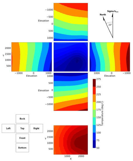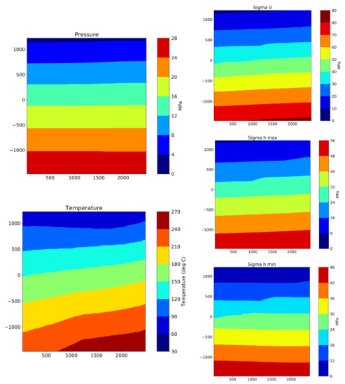 Figure 13 and Figure 14 show this simulated native state pressure and stress on the edges of the model domain. Temperature results not plotted as Dirichlet conditions were assigned on all sides of the domain. The pressure results for the bottom of the model domain show significant variation, largely due to the significant differences in the thermal regime (see Figure 9). As shown in Figure 9, the temperature assigned to the bottom of the model domain ranged from approximately 220 C to 270 C, resulting in fluid density differences of over 70 kg/m.