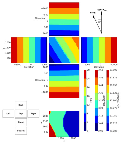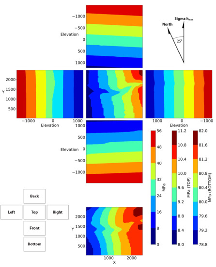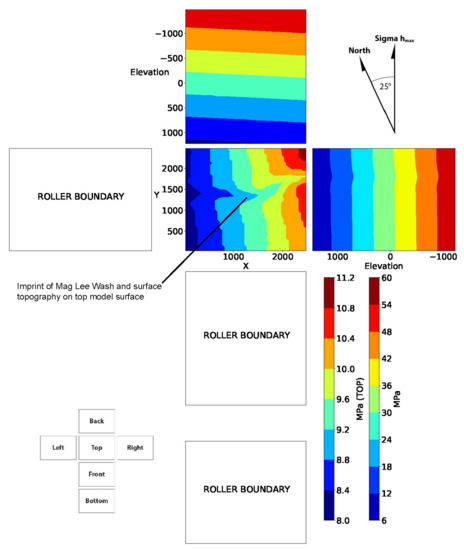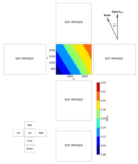 A gradient of 0.014 MPa/m (0.62 psi/ft) was applied to the east side of the model domain (S direction), while the left/west was fixed at zero displacement. Values ranged from approximately 8 MPa to over 45 MPa. A S gradient of 0.0174 MPa/m (0.77 psi/ft) was applied to the back side of the model domain, while the front was fixed at zero displacement. Values ranged from approximately 11 MPa to nearly 55 MPa. Figure 11 shows the stress values used on the boundaries.