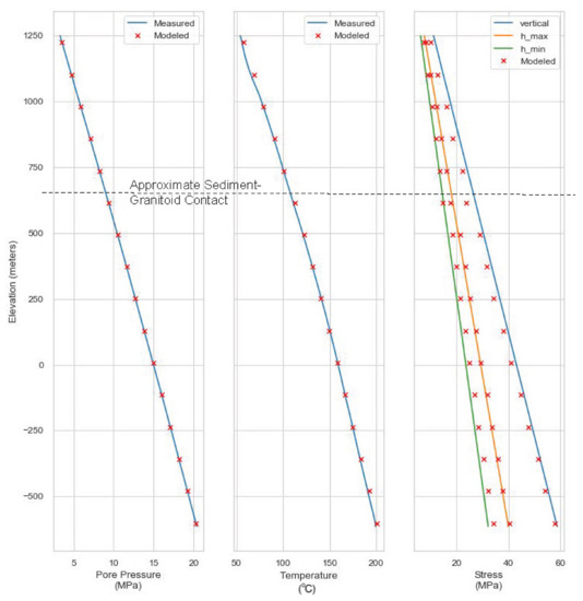 Figure 12 presents the modeled pressure, temperature, and stress along the trajectory of Well 58-32 with the data from pressure-temperature logging collected in November 2018. As seen in Figure 12, the simulated pressure and temperature match the well log data quite well. The pressure distribution is linear along the length of well and shows little differentiation between the alluvium and granitoid materials. The modeled temperature distribution for Well 58-32 also matches the field data well and shows a break in slope at the sediment-granitoid contact. Input and mesh files for the native state simulations can be found in the Geothermal Data Repository [53].