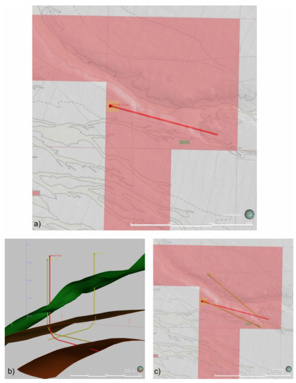 Map view of the FORGE site (red shaded area) showing the proposed trajectory for the first Phase 3 well (a); oblique cross-section view that shows the top of the granite surface (green); 175 C and 225 C isosurfaces and several previously evaluated trajectories (b); and a map view showing several previously evaluated trajectories (yellow lines) and the recommended trajectory (red line) (c). Scale bar on top figure represents 1500 m.