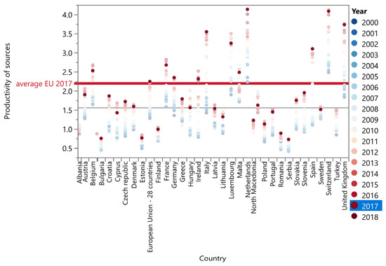 At the same time, the average value of the indicator moved from 1.17 (in 2000) to 2.35 (in 2018), which presents 200% growth during 18 years (see Figure 2). EU countries are then on average able to produce double the volume of production compared to in 2000, with the same inputs.
