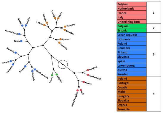 Finally, ranked values were scored, while the first place means 1 point, second place 0.5, and third place 0.3. According to the summary of obtained points, we constructed a chart of clusters according to the ability to use resources effectively. The best results were achieved in the first cluster, which achieved the best average values in the EU, in the case of five indicators—5.5 points. The cluster is presented by Belgium, the Netherlands, France, Italy, and England. The countries have at the same time one of the lowest tax burdens in case of energy taxes and the environment. The worst results were recorded in countries from the second cluster with 0.5 points—Bulgaria and Estonia. These countries produce almost eight times more waste and they produce waste stocks five times higher, as compared to the first cluster. At the same time, there are countries that in comparing with the first cluster achieve only one-third level of indicators, a shown in the measure of recycling, index of eco-innovation, and measure of material use in a cycle. The productivity of resources is at the level 0.79 and these countries have the highest tax burden in the frame of environmental and energy policy.