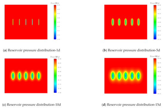 Figure 2 indicates that the reservoir pressure decreases with the production process over a 15-day period. Apparently, the reservoir pressure distribution demonstrates the distinct trait of horizontal multistage fractured well production. Reservoir fluids flow into the well only through fractures, which induces a major pressure drop. Figure 3 reveals the variation of wellbore temperature for different stress sensitivity coefficients. is the discrepancy between the fracture temperature and initial reservoir temperature. As shown in Figure 3: (1) In the flowback stage, the temperature of the water (fracturing fluid) is actually lower than that of the oil at the same layer due to the difference of the Joule–Thomson coefficient. Therefore, the oil-water two-phase flow into the wellbore will entail a decrease in the wellbore temperature. (2) When the stress sensitivity is taken into account, the permeability at the fracture diminishes and the production pressure difference enlarges, which amplifies the Joule–Thomson effect on oil temperature, so the temperature variation decreases when flowing into the wellbore.