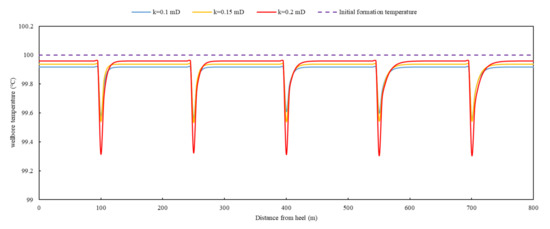 Assuming the formation permeability of 0.1 mD, 0.15 mD, and 0.2 mD, and other parameters remaining constant, the coupled thermal model is applied to simulate the temperature distribution of the well. Figure 5 indicates that the higher the formation permeability, the smaller the production pressure difference. Thus, the oil temperature change caused by the Joule–Thomson effect is smaller, the cooling effect of water in the two-phase flow is more conspicuous, and the temperature at the fractures declines more [34].