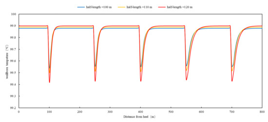 The fracture parameters affecting the wellbore temperature profile of fractured horizontal wells are fracture half-length and fracture conductivity [36]. Assuming other parameters are constant, the temperature distribution of the fractured horizontal well with fracture half-length of 100 m, 110 m, and 120 m is simulated using the above coupled temperature model. As shown in Figure 7, a positive correlation exists between inflow temperature and fracture half-length. With the increase of the fracture half-length, the cooling effect of water becomes more significant, which contributes to a decrease in wellbore temperature.