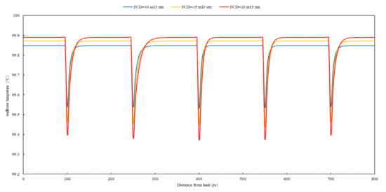 Hypothesizing that the conductivity of fractures formed after fracturing is 10 md cm, 15 md cm, and 20 md cm, and other parameters remaining constant, the temperature distribution profiles of the fractured horizontal well with different conductivity coefficients are simulated in Figure 8. As the fracture conductivity coefficient increases, the flow resistance of fluid in the fracture decreases, and the heat loss due to viscous dissipation decreases. Hence, the inflow temperature at the fracture location rises appreciably.