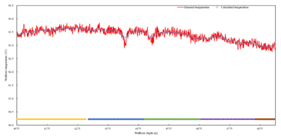 The temperature prediction model for a multistage fractured horizontal well with stress sensitivity established in Section 2 predicts the temperature profile of a tight oil fractured horizontal well. M1 is a tight oil reservoir multistage fractured horizontal well in the Junggar Basin. The relevant parameters of this well are shown in Table 4. The temperature profile of M1 well 4075 m (7th fracture)–4930.3 m (3rd fracture) in the shut-in and production stage was measured by DTS, as shown in Figure 9.