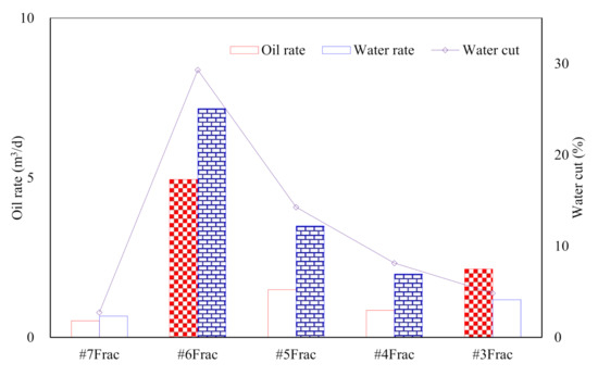 The shut-in temperature is applied as the initial formation temperature, and the borehole trajectory, geothermal gradient, formation, and fluid parameters are input. The constructed temperature model is fitted to the DTS data at t = 6 h, with the flow rate of 25 m³/d. The measured data and fitted data are shown in Figure 10, which indicates that the simulated calculation result fits well with the measured temperature, and the temperature change trend from the toe to the root of the wellbore is consistent. The inflow of low-temperature fluid leads to the decline of 4434 m (6th fracture) and 4519 m (5th fracture), and the thermal convection effect plays a dominant role. According to the temperature fitting results, the production profile of each fracture in Well M1 can be inverted. As shown in Figure 11, the 3rd, 5th, and 6th stage fractures are the main production zones in the horizontal well.