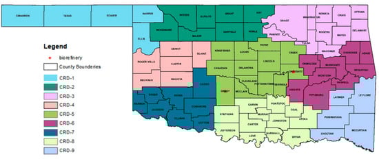 Lengthy switchgrass yield time series data are not available for multiple Oklahoma locations. The Environmental Policy Integrated Climate (EPIC) model [61] is employed to simulate switchgrass yield for Oklahoma Crop Reporting Districts (CRDs). Each CRD is considered a homogeneous production area. CRDs are composed of five or more counties in Oklahoma (Figure 1). There are nine CRDs in Oklahoma.