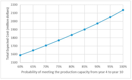 Trade-offs between total expected cost and probability of meeting the production capacity.