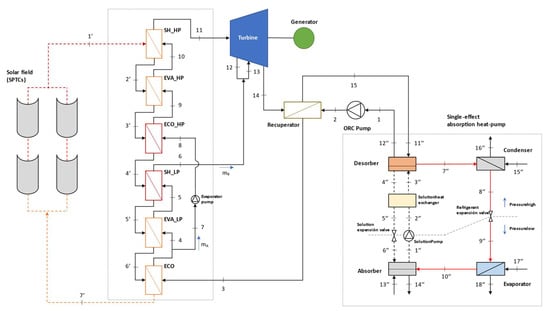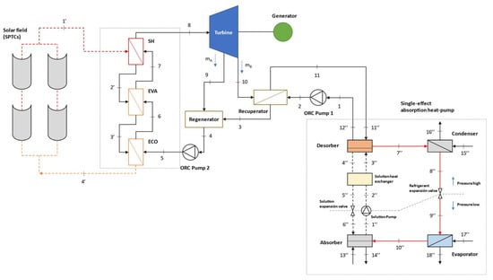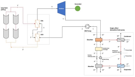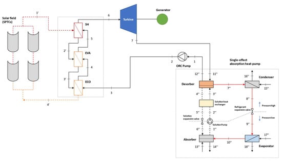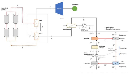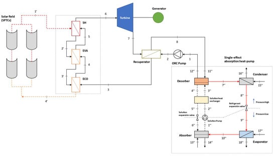The CCHP system assessed in this study is mainly composed of an ORC as a power generator, which is driven by a field of SPTCs. Six alternative ORC layouts are compared under steady-state conditions and seven organic fluids are considered as working medium. A single-effect H2O/LiBr absorption heat pump is integrated as a bottoming cycle to meet heating and cooling demands simultaneously.