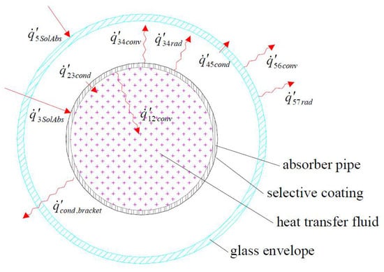 Considering that the region between the absorber pipe and the glass envelope has been vacuumed, the convective heat transfer between the two surfaces () can be considered negligible. Hence, under these assumptions, the useful thermal power () can be reformulated as follows: