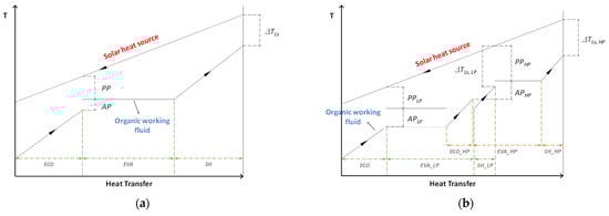 Figure 8 represents the correspondent heat transfer–temperature diagrams for a single-pressure evaporator with superheater (a) that applies to Cases 2, 4–5, and for a dual-pressure evaporator with low-pressure and high-pressure superheaters, (b) that applies to Case 6.