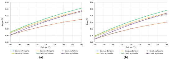 Effect of the solar field outlet temperature on: (a) ORC energy efficiency; (b) CCHP exergy efficiency.